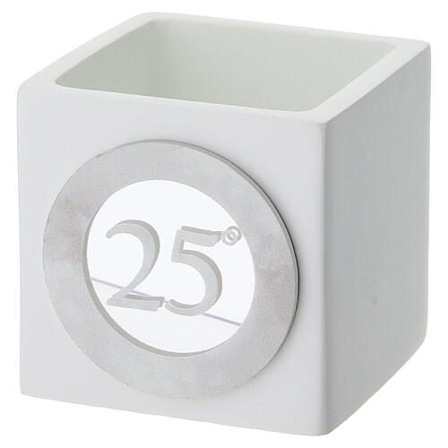 Cube box favor for the Silver Wedding anniversary. It features a circular plaque with the number 25, symbolizing twenty-five years of marriage. Compact size, ideal as a keepsake to give on the occasion of the anniversary or as a small decorative tabletop ornament. Made in Italy. Dimensions: 6x6 cm.