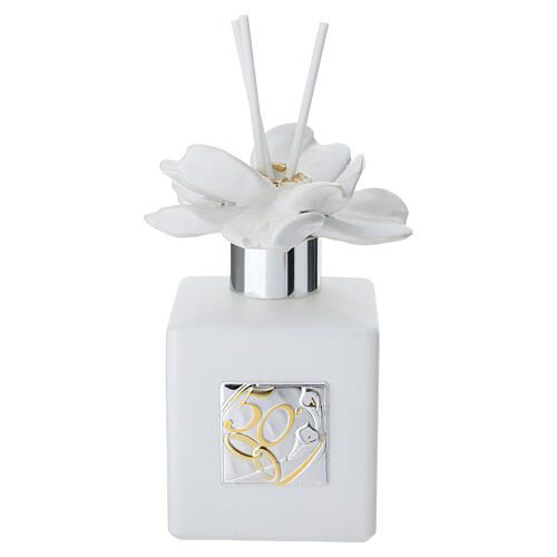 200 ml home fragrance diffuser decorated for the Golden Wedding. The diffuser features a laminated metal plaque with the number 50 to commemorate fifty years of marriage. It is supplied with reed sticks, it is ideal as an anniversary favor or gift to celebrate this milestone. Its compact design makes it suitable for placement on furniture, shelves or tables. Capacity: 200 ml. Dimensions: 13x6 cm.