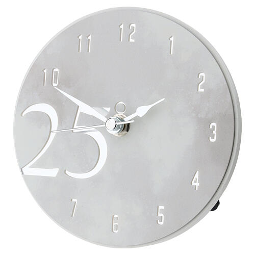 Table clock favor for a Silver Wedding Anniversary with a round frame and a central decoration showing the number 25. The numerals, hands and central detail are finished in polished silver to recall the anniversary. Fitted with a rear easel; when opened it has a depth of 9 cm, making it suitable for display on furniture and shelves. Made in Italy. Battery-powered for practical use. Power: 1 AA battery (not included). Diameter: 15 cm.