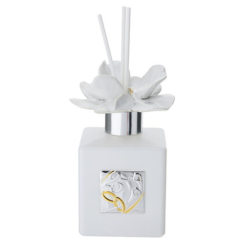 200 ml room diffuser with a floral decoration, designed to celebrate a Silver Wedding. The double-layer metal tag bears golden wedding rings and the number 25, symbolizing twenty-five years of marriage. The body is enhanced with bicolor gold and silver details in keeping with the anniversary theme. It is supplied with reed sticks, it is ideal as a wedding favor or commemorative gift for this important milestone. Capacity: 200 ml. Dimensions: 13 x 6 cm.