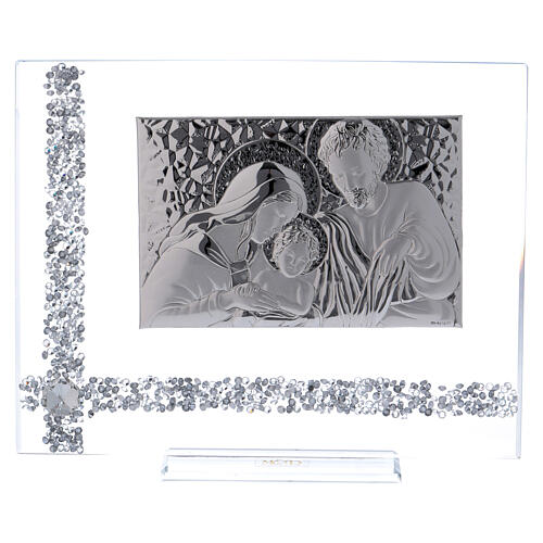 Glass frame with crystals and Holy Family 6.1x7.5 in. Glass decorated frame with central silver foil and two perpendicular stripes of crystals.