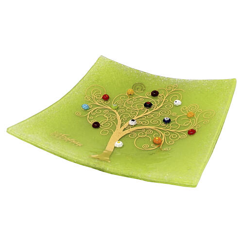 Square green transparent glass trinket dish featuring a central Tree of Life motif in 24‑carat gold leaf and Venetian murrine in Murano glass. Size: 20x20 cm. Branded SOSPIRI VENEZIA and supplied with Made in Italy certification, guaranteeing artisanal quality and verified origin. Versatile as a personal catchall, display tray or light decorative accessory. Delivered in a rigid white gift box, suitable for personal use or as a special gift. Gift box dimensions: 3 x 18 x 18 cm.