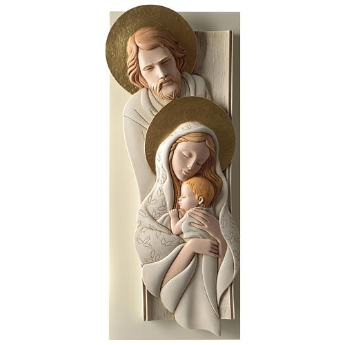 Holy Family, vertical bas-relief in painted resin and wood with golden details